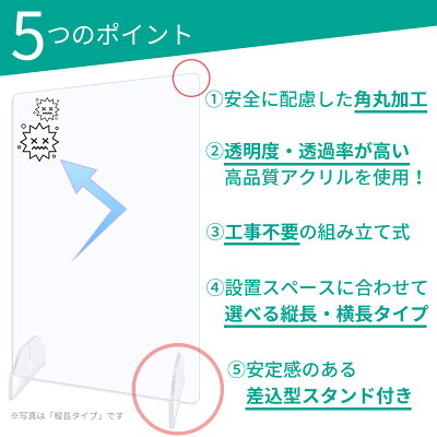 アクリルパーテーション パーティション 仕切り 間仕切り 衝立 日本製 アクリル 国産 透明 クリア パネル 板 ボード 自立 スタンド 足 脚 付き 窓なし 開口部 無し 新型 コロナ ウィルス ウイルス 飛沫 感染 予防 拡大 防止 対策 まん延防止等重点措置 まん防 アクリル板 設置 小型 小さい 小さめ S Sサイズ 小 ミニ mini コンパクト 角丸 卓上 縦長 横長 縦横 組み立て式 簡単 簡易型 飲食店 カフェ 居酒屋 お店 店舗 会社 オフィス カウンター テーブル デスク 机 会議室 受付 窓口 病院 薬局 クリニック サロン 学校 塾 教室 保育園 幼稚園 介護施設 補助金 助成金 高さ 幅 450 300 mm 45 30 cm 3mm 450mm 300mm 45cm 30cm 並べて 900 600サイズ 【縦長(タテ)型】 ・板:(約)高さ450mm × 横幅300mm × 厚さ3mm ・スタンド:(約)高さ60mm × 幅100mm × 厚さ5mm 【横長(ヨコ)型】 ・板:(約)高さ300mm × 横幅450mm × 厚さ3mm ・スタンド:(約)高さ60mm × 幅100mm × 厚さ5mm その他 ・組み立て前に保護フィルムを剥がしてからご使用ください。