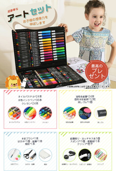 アイテム情報 商品仕様 セット内容:オイルパステル、クレヨン、色鉛筆、 水性マーカー、粉末状のケーキ、水彩絵の具(白)、 クリップ、ブラシ、定規、消しゴム、はさみ、 鉛筆削り、スポンジ ケース サイズ:37.3*28.8*4 cm(約) 商品ポイント 【安全で高品質なアイテム】 子どもに優しい安全で高品質な材料を採用しております。